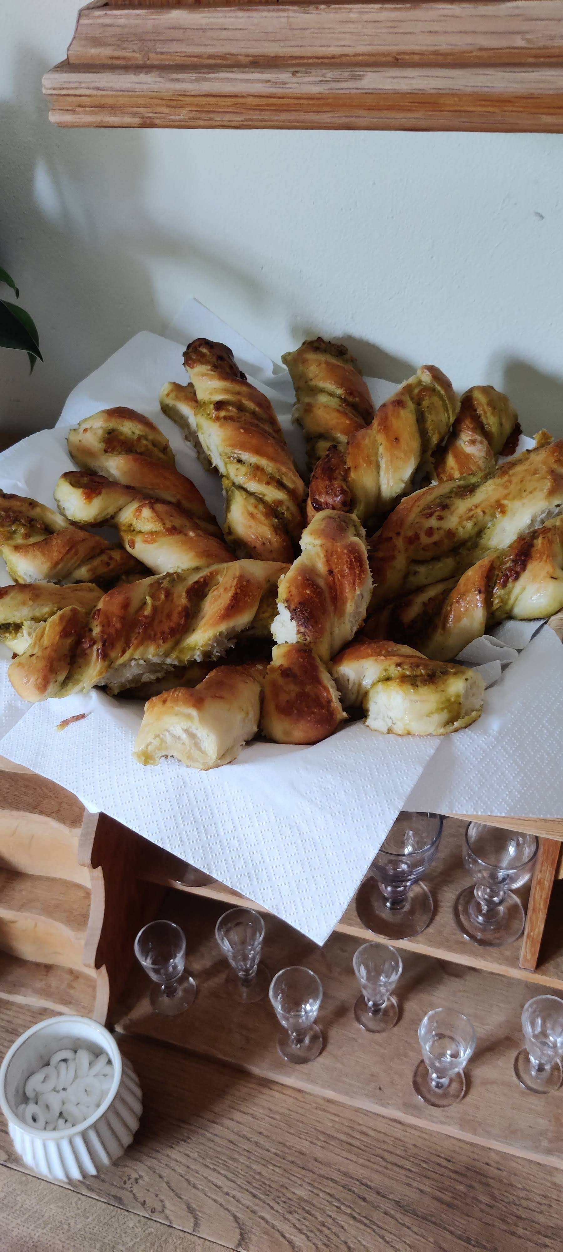 - Pensl brødene med æg og bag dem til de er gyldne. Pensl de nybagte snurrer med lidt pesto. (jeg penslede dem ikke, de vil blive alt for fedtede)
