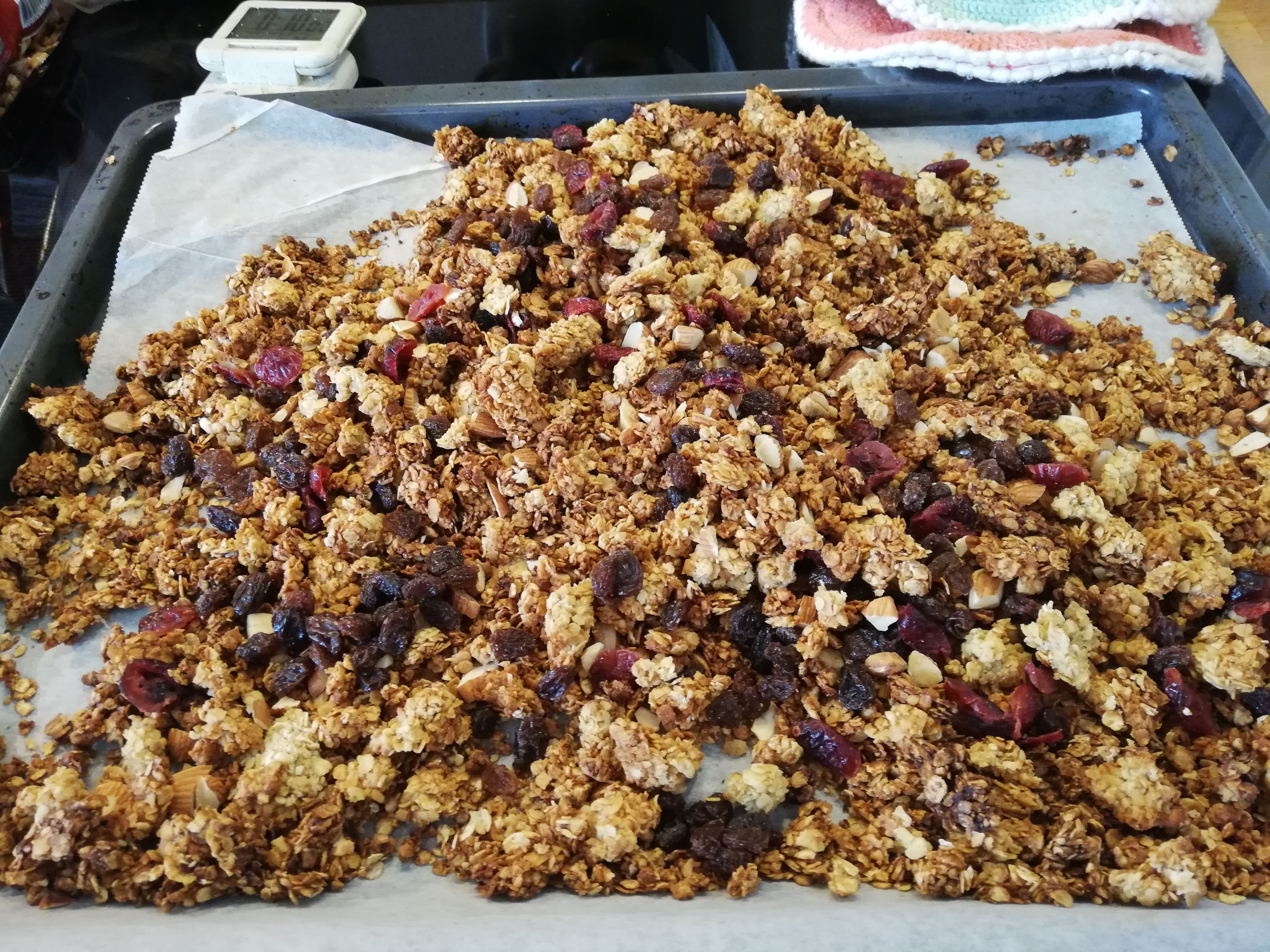 Bland alle ingredinserne (undtagen nødder/mandler og tranebær/rosiner). på en bageplade med bagepapir. Sæt den i en 175 gr varm ovn. Læg et stykke bagepapir over og bag ca. ½ time. Rør rundt af og til. Den skal bages gylden. Tilsæt førsts nødder eller mandler de sidste 10 min af bagetiden.