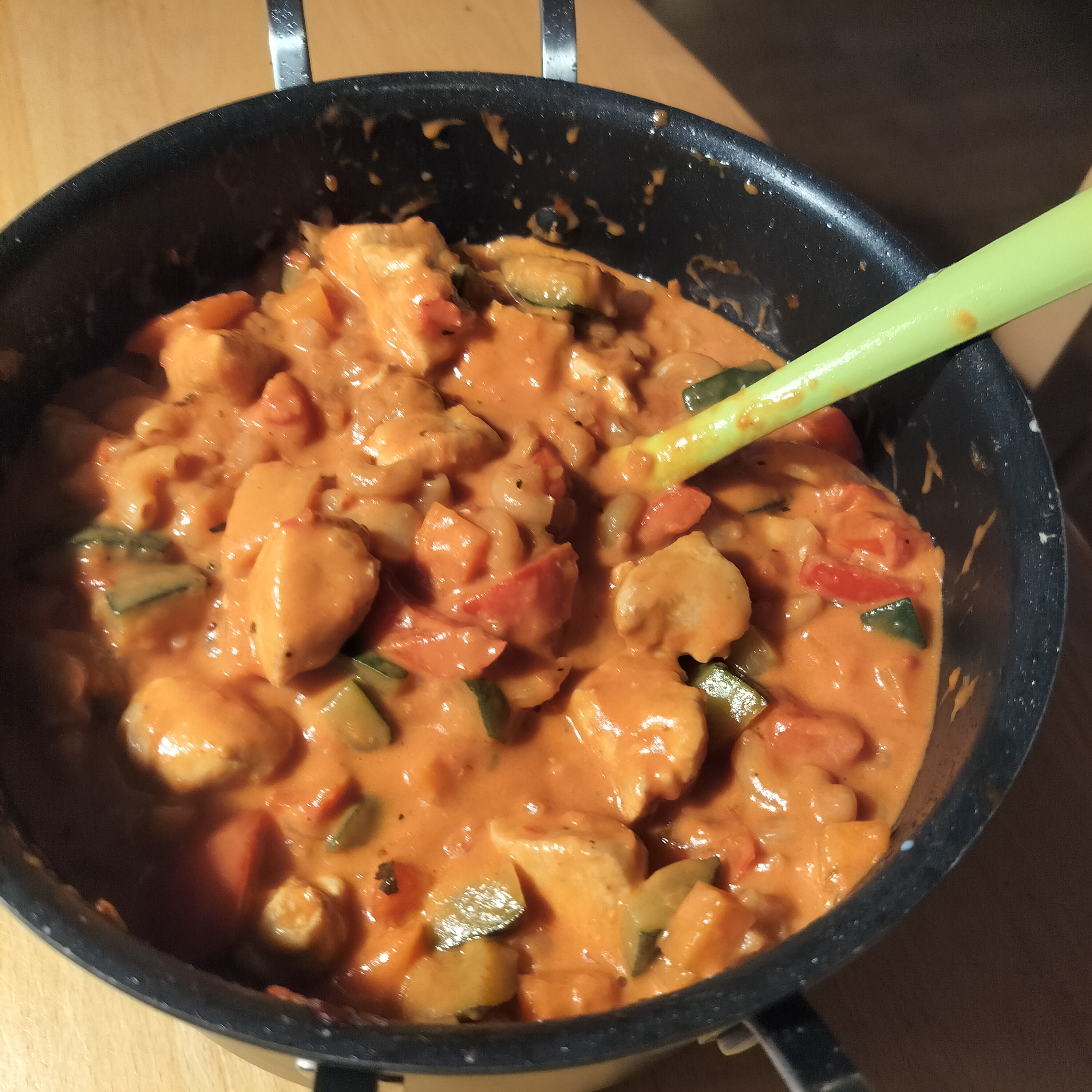Start med at skære kyllingekødet ud i mundrette stykker. Krydr kødet med salt og peber og steg dem i halvdelen af olien ved middelhøj varme til de er gennemstegte. Forbered grøntsagerne imens. Pil løg og hvidløg, hak dem. Skræl gulerødderne og skær i små tern. Skyl peberfrugt og squash og skær i tern. Tag kødet op af panden/gryden og svits herefter grøntsagerne i den resterende olie i 5 min ved høj varme. Pres hvidløget over. Tilsæt fløde og krydr med salt og peber. Kom kyllingen tilbage i retten og lad den simre i 5 min til grøntsagerne er møre og fløden kogt lidt ind. Drys med krydderurter og server med ris, kartofler eller pasta eller spis den som den er.