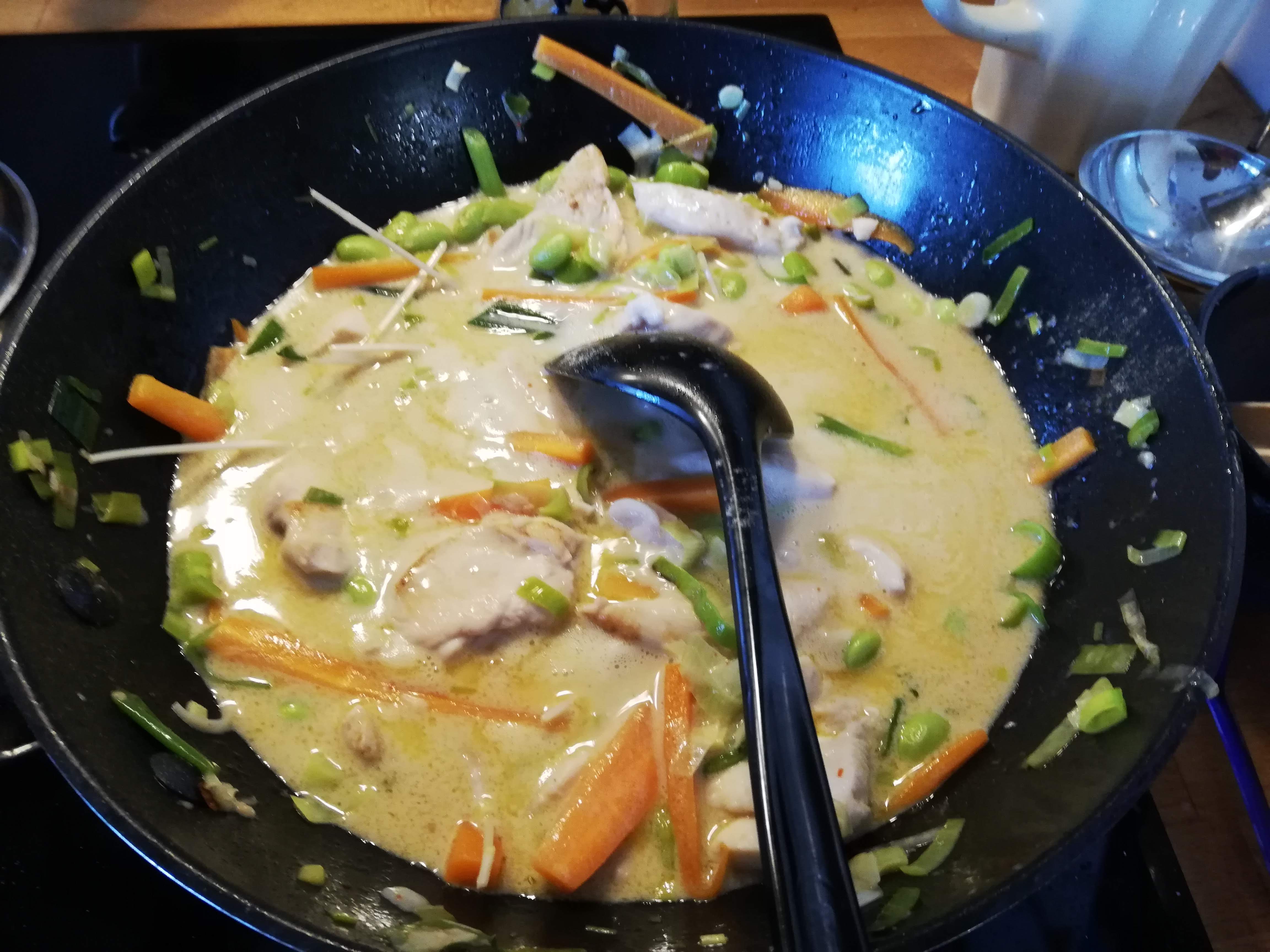 Snit porrerne i tynde skiver og gulerødderne i tynde stave. Rist grønsagerne i olie i wokken. Når de er halvfærdige, skubbes de til side i gryden. Tilsæt evt mere olie og rist kalkunstrimlerne lidt ad gangen. Når kødet er ristet, blandes det hele godt. Krydr med soya, hvidløg i skiver samt lidt stødt ingefær (eller 1 cm finhakket frisk) og det hele ristes sammen et par minutter. Tilsæt evt. woksauce og kokosmælk, kog igennem. Tilsæt spirer og vend dem i retten.