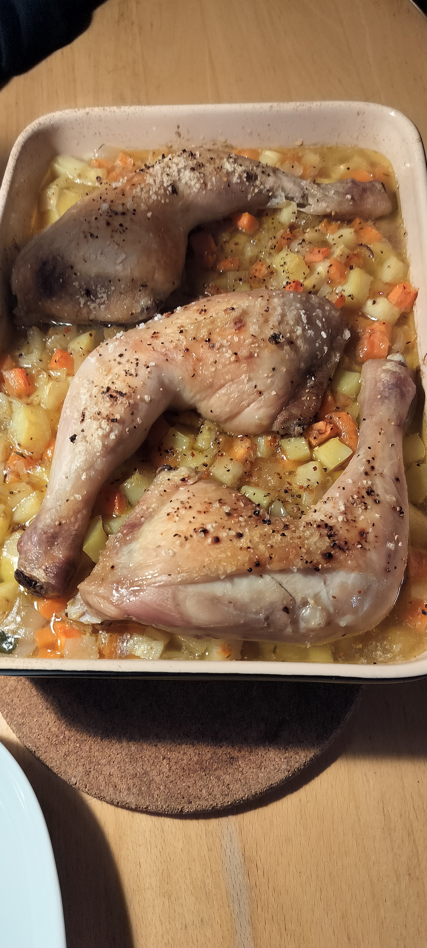 Skræl eller skrub rodfrugterne og skær dem i tern sammen med løget. Steg dem i olie sammen med timian i en stor gryde i ca. 5 min. Hæld bouillon ved så det når et par cm op i gryden og lad det småsnurre 5 min. Hæld det derefter i et stor ovnfast fad. Krydr med peber. Dup lårene tørre, drys med salt og og placer dem ovenpå. Steg det hele mørt i ovnen 190 gr i ca. 40 min