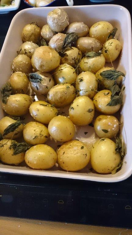 Hæld kartoflerne i et ildfast fad. Hæld olie på, bland lidt rund. Drys med salt og bland igen. Put stilke af krydderurter ned mellem kartoflerne. Sættes i 200 gr varm ovn i 20 - 30 min.