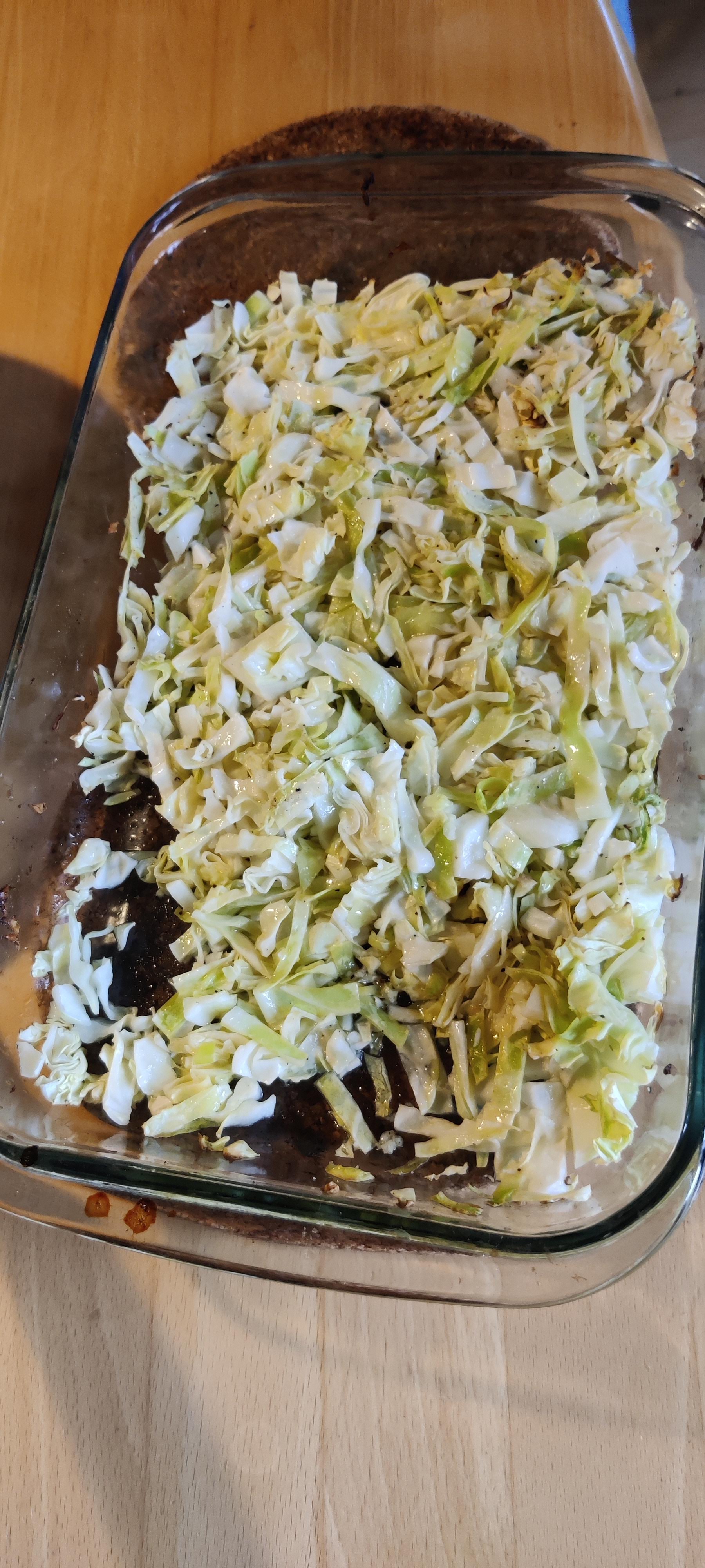 Tænd ovnen på 200 gr. Snit kålen fint, husk at fjerne stokken. Læg kålen i et smurt ovnfad. Rør olie, citron, salt, peber og presset hvidløg sammen og hæld det over kålen. Vend godt rundt så der kommer olie over det hele. Lidt smørklatter fordeles, ikke for meget.