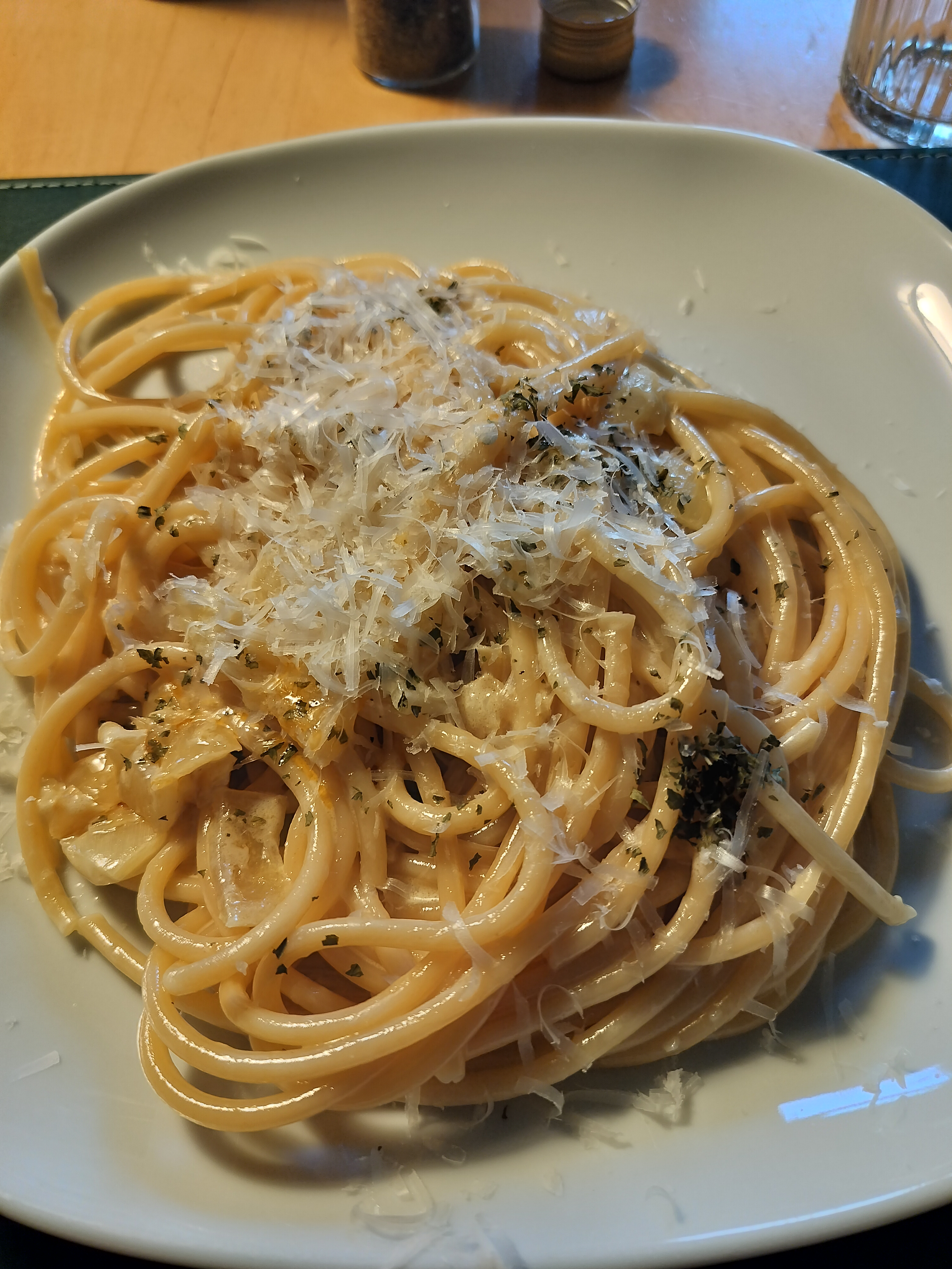 Kog pastaen efter anvisning og dræn for vand. Kom smør og olie på en pande. Steg løgene ved middelvarme i ca. 5-7 min til de er karamelliserede og gyldne. Tag løgene fra panden. Kom lidt olie på panden og steg hvidløg og chiliolie i ca. 30 sek. Tilsæt fløde, salt parmesan og løg til panden og rør godt sammen. Vend til sidt pastaen i. Server med mere chiliolie og frisk persille