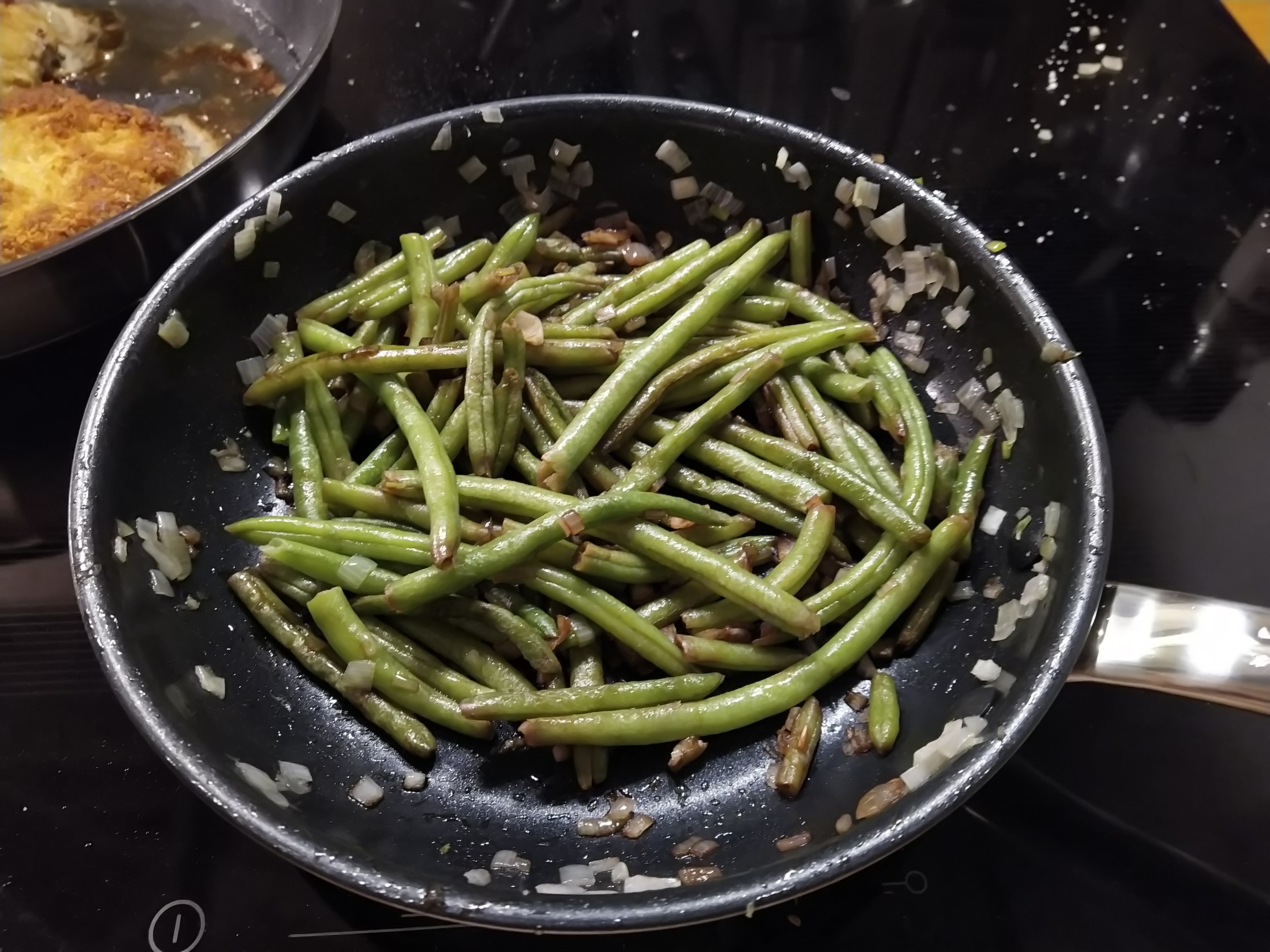 Bønnerne nippes og skylles. Skalotteløg og hvidløg finhakkes. Bønnerne og skalotteløget sauteres på en pande et par min. Det finhakkede hvidløg tilsættes sammen med et drys salt. Småsnurrer yderligere 4-5 min. Tilsæt lidt balsamico og rør rundt og lad gennemvarme.