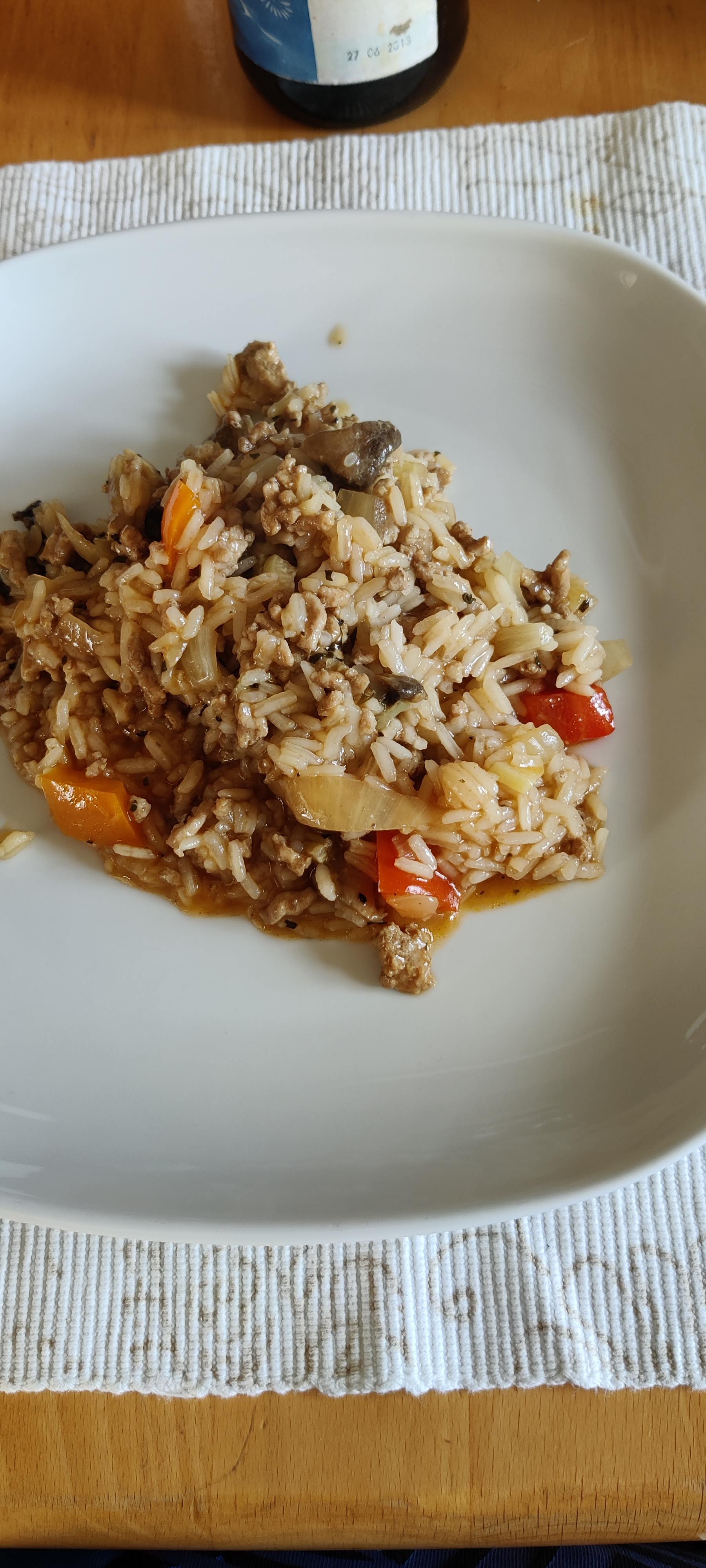 Skær løgene i små tern, svits karry i margarine og tilsæt løg og champignon og ½ peberfrugt i tern. Lad det snurre et par min. Tilsæt det hakkede kød og rør godt. Lad det hele stege til kødet skifter farve. Tilsæt bouillonterning, krydderier, vand ketchup og soya. Hæld den ønskede mængde ris i og kog i 18 min ved svag varme. Smag til og pynt med resten af peberfrugten
