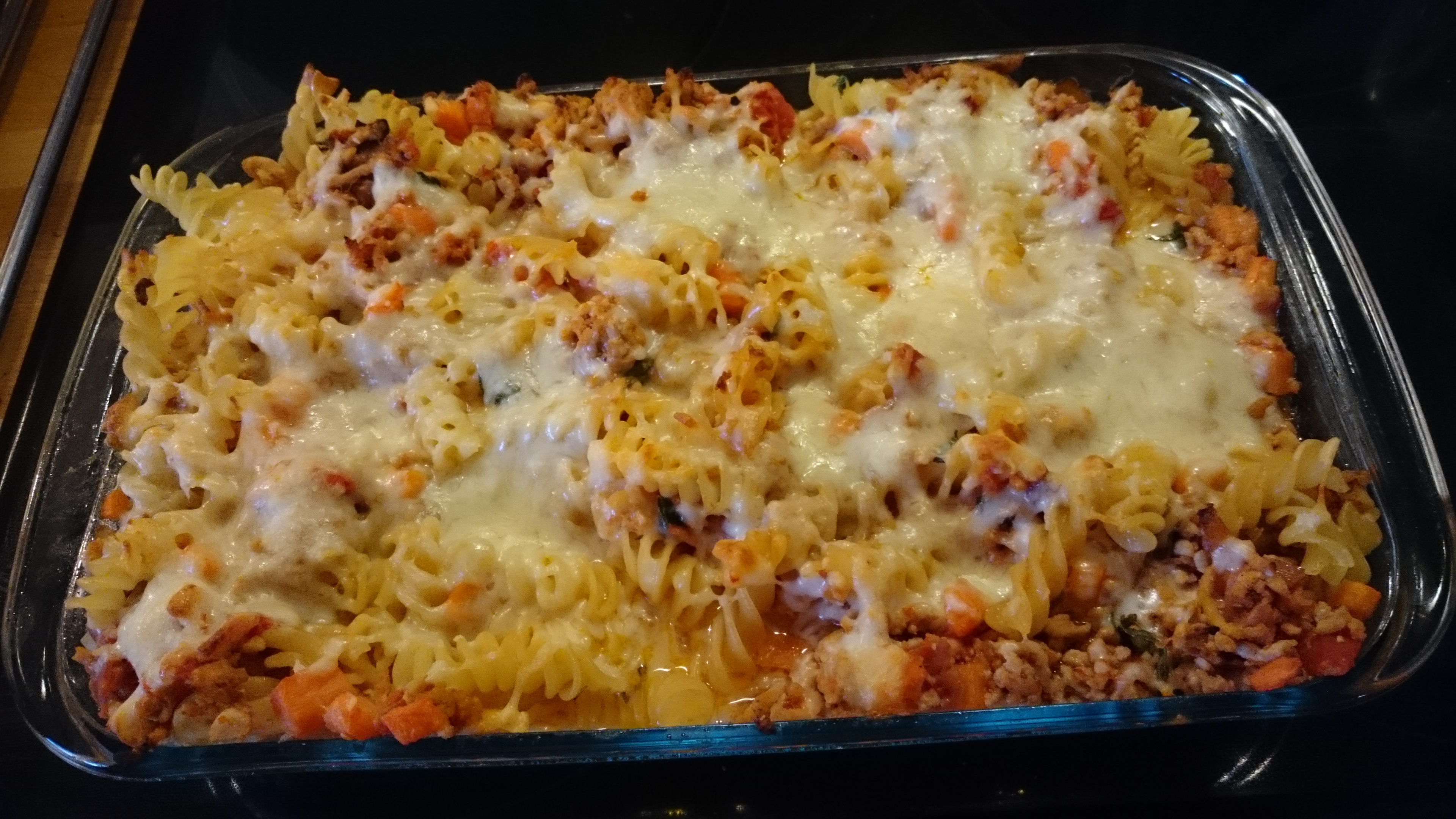 Kog pasta som angivet på posen og skyl i koldt vand. Brun bacon på en pande, tag det op på fedtsugende papir og brun så kødet i baconfedtet (tilsæt evt. lidt mere fedtstof). Når kødet er godt brunet hældes bacon tilbage. Drys med salt. Tilsæt hakket rødløg, gulerod i tern samt rosmarin og hvidløg steg et par min. Tilsæt tomat, kog op og smag til med salt og peber. Bland kødet med pastaen, de sammenpiskede æg, strimlet basilikum samt 2/3 af osten i et ovnfast fad. Drys med resten af osten og bag ved 180 gr. i ca 20 min til osten er gylden og æggemassen stivnet. Lad den stå 5 min før servering.