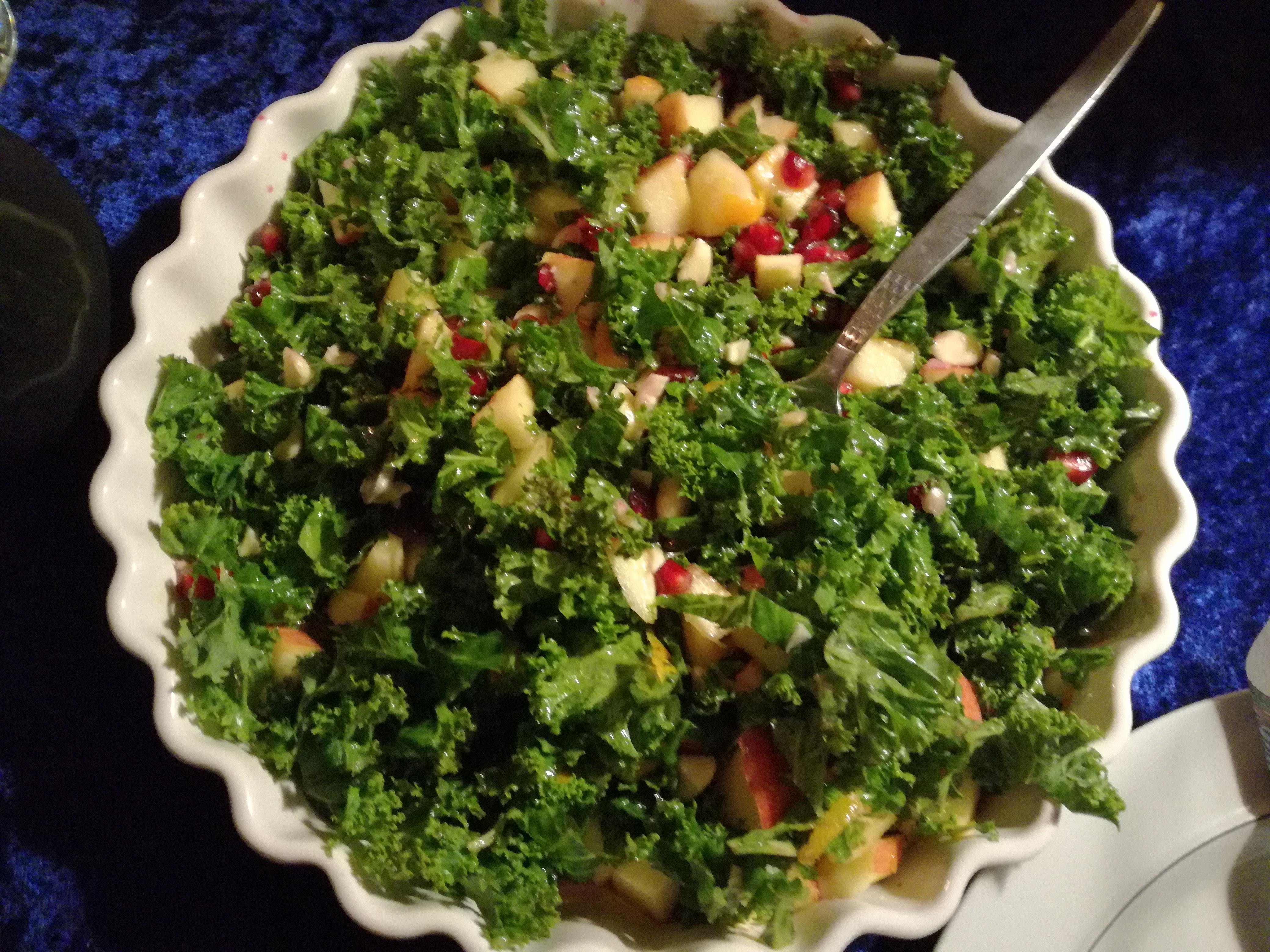 Skyl grønkålen grundigt, der er mange krøller på bladene. Hak grønkålen fint, skær æblerne i små tern og bland dem med olie, revet appelsinskal og - saft. Skold og smut mandlerne og lad dem tørre. Bank godt på granatæblet og tag kernerne ud. Anret grønkålen på et fad, fordel granatæblekerner og mandler over og server