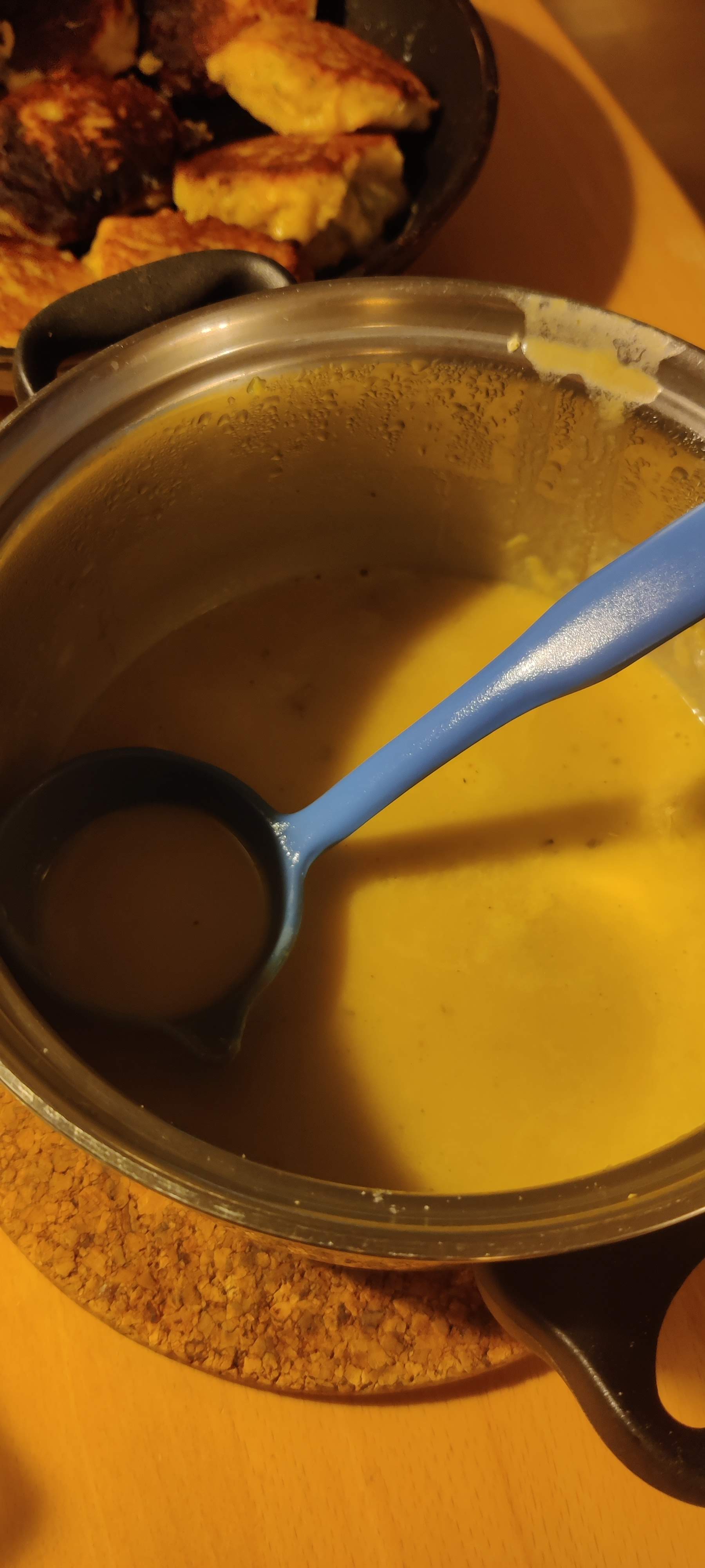 Kog vand og terning op og sæt til side. Kom smør i en kasserolle, smelt det og pisk melet i. Pisk derefter gradvist bouilionen i og derfter mælk, til konsistensen er som ønsket. Riv skallen af citronen og pres lidt saft ud. Smag saucen til med begge dele så smagen er som du ønsker - husk også at smage til med salt og peber
