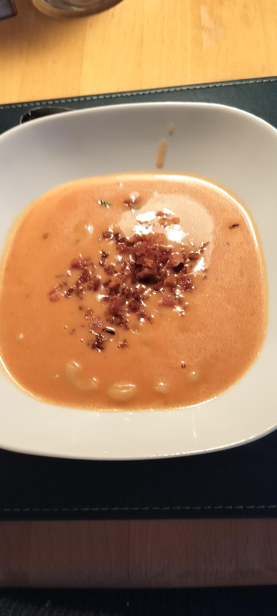 Lav en opbagning af margarine og mel. Tilsæt det røgede vand. Lad det koge igennem. Tilsæt tomapure og bouillonterning. Rør godt. Tilsæt piskefløde, kog igennem og smag til med krydderer. Til sidst hældes fiskbollerne og de kogte suppehorn. Drys med smuldret sprødstegt bacon og server med flute