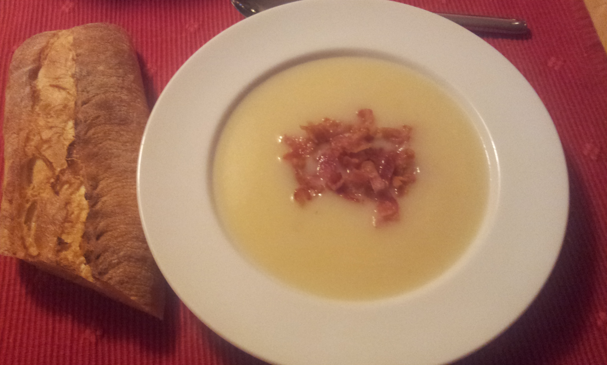Skræl og skær alle grønsager i mindre stykker, put dem i en gryde og tilsæt bouillon eller vand og terning. Kog op og lad koge til alle grønsager er godt møre, vel 20 min. Steg imens baconen sprød og læg den på køkkenrulle på en tallerkenTag gryden af varmen og blend suppen med stavblender. Sæt gryden tilbage på varmen og tilsæt fløde efter smag og kog op. Smag til med salt og peber.