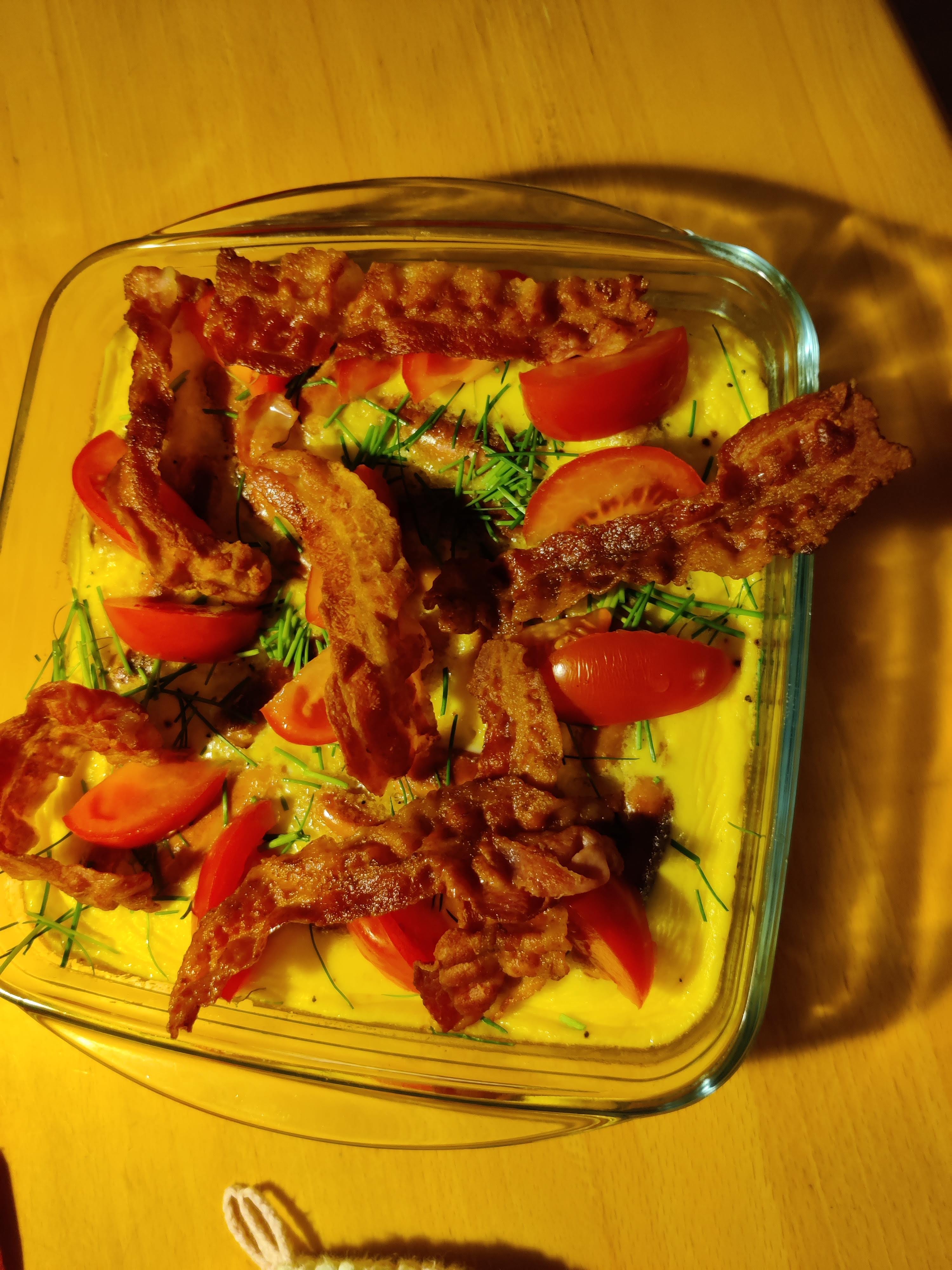 Steg bacon sprødt på en pande og læg på æggekagen.