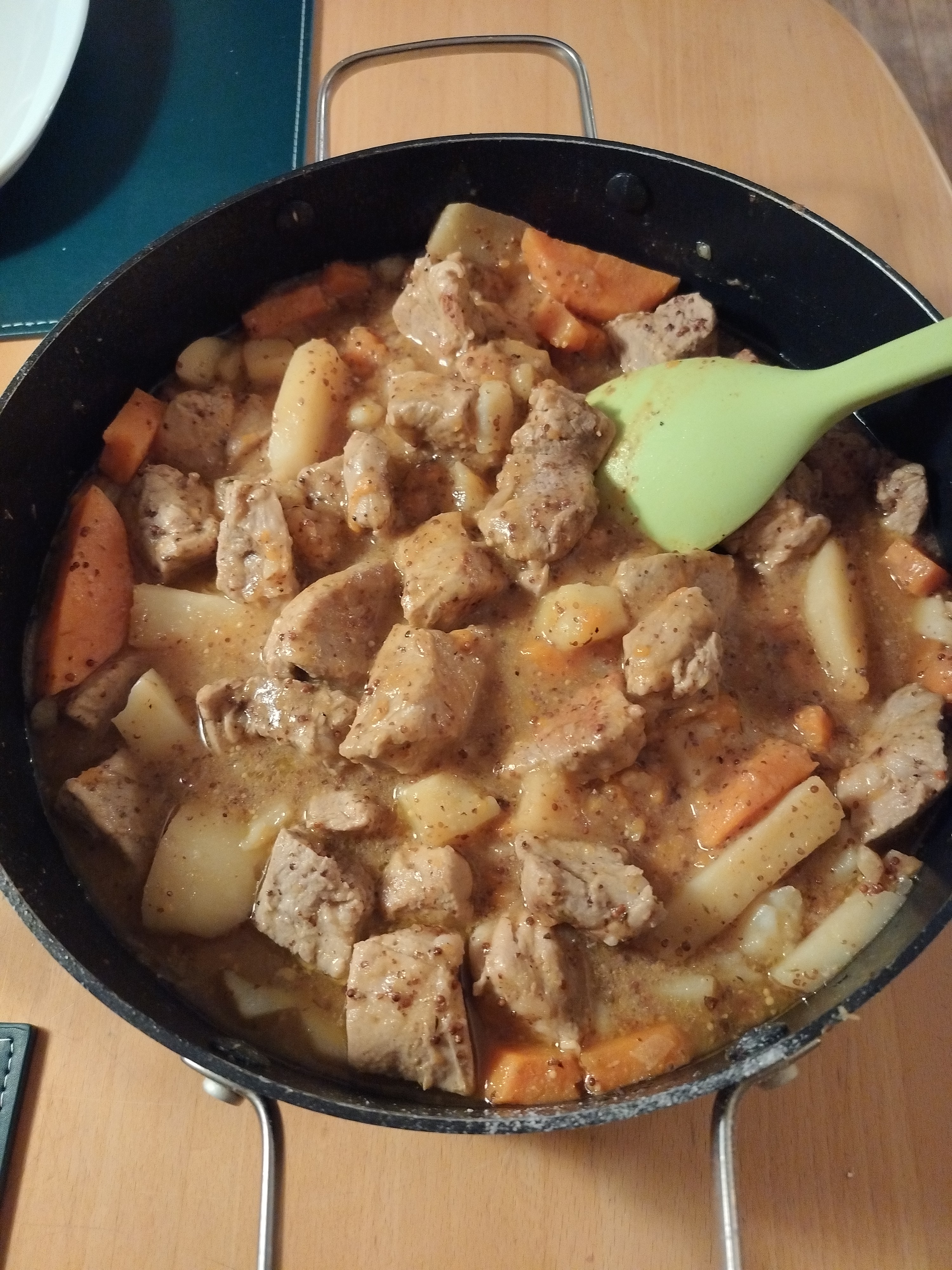 Afpuds mørbraden, skær den i store tern. Vend dem med sennep, salt og peber. Lad kødet marinere i ½ time. Pil og hak hvidløg og skalotteløg. Skræl pastinakker og bagekartofler, skær dem i grove stave. Hak timian. Smelt smør i en sauterpande eller en gryde m. bred bund. Svits løg og hvidløg let. Tilsæt det marinerede kød, drys med salt og steg det i 3-4 min til det får farve på begge sider. Tilsæt pastinak, kartofler og timian. Krydr med salt og peber. Hæld bouillon i og læg låg på. Lad retten simre i 20 min. til grøntsagerne er møre. Retten kan jævnes med Maizena eller andet hvis det er nødvendigt